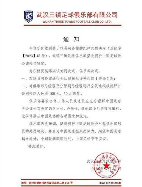 武汉三镇表示,要坚决支持足协的处罚决定,并对总经理和分管经理处以100元、50元罚款。