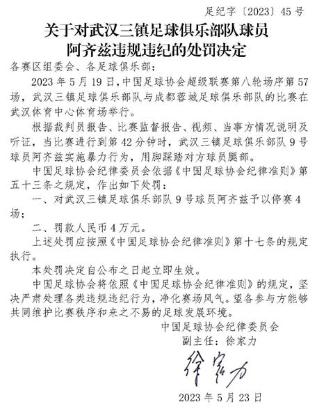 今天足协正式公布罚单,阿齐兹踩在蓉城球员的腿上,停赛4场罚款4万。