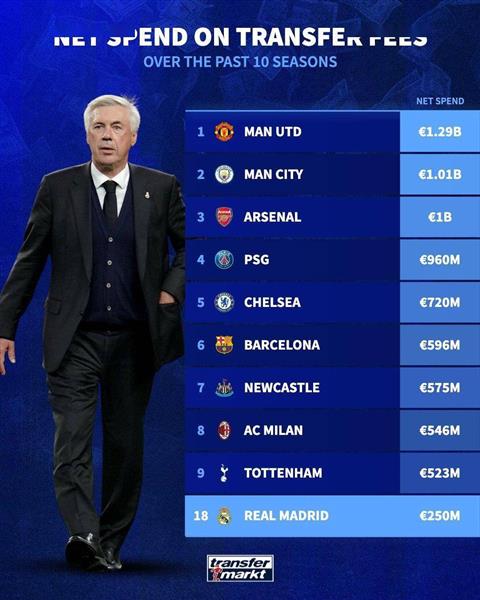 在德国的报告中,详细列出了皇马的转会情况。过去10个赛季,皇马在转会费方面净支出达到了2.5亿欧元,排名第18位。