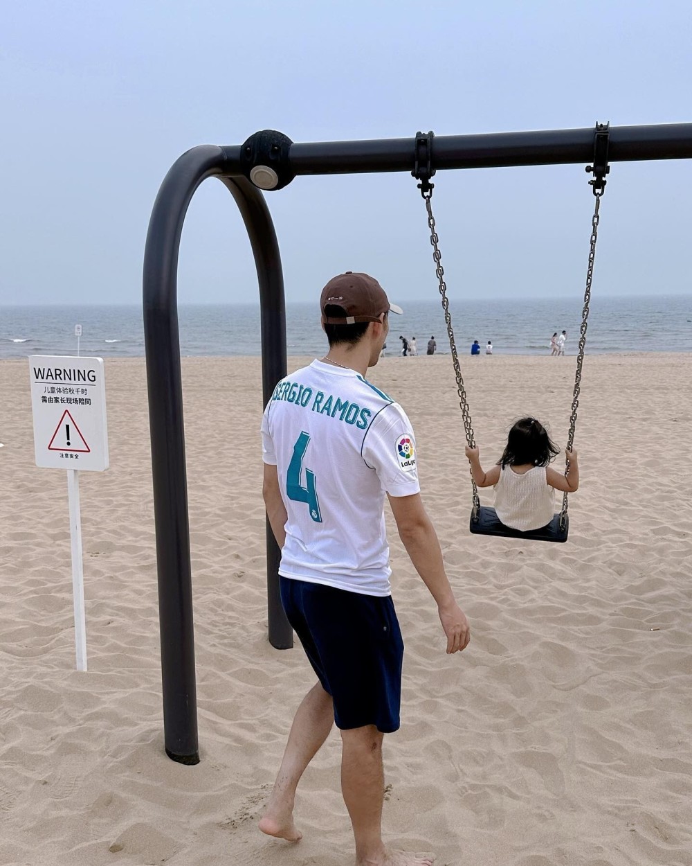 休赛期,李源一和孩子们在北戴河阿那亚风景名胜区,这里是北方著名的滨海景点。他带着孩子们玩秋千,面朝大海,非常温暖。