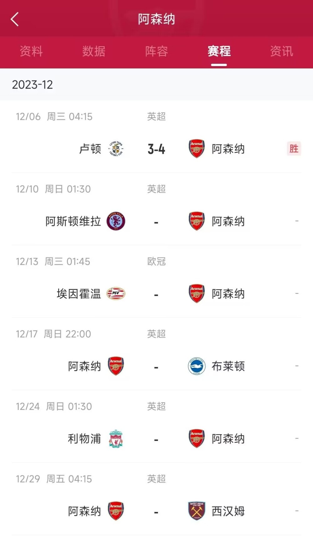 阿森纳赛程: