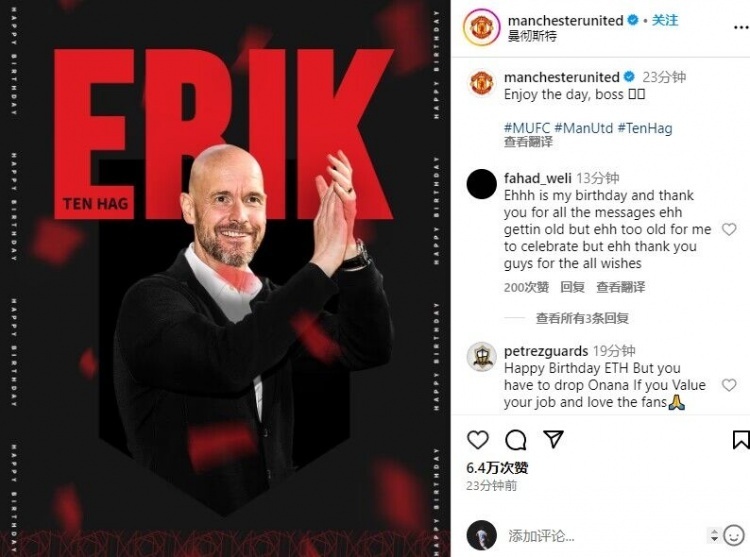 曼联正式发布了滕哈赫的生日海报,并写道:“享受今天,boss”