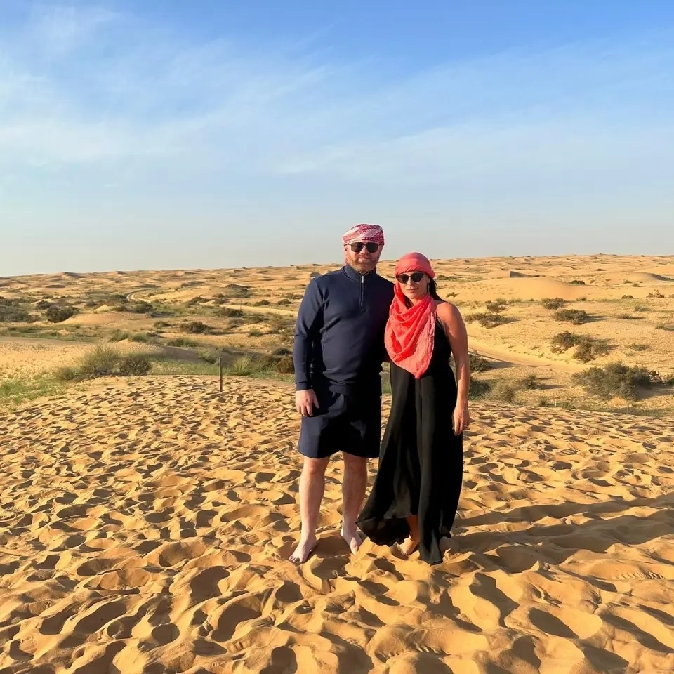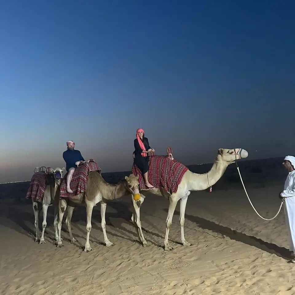 科琳在社交媒体上分享了他和鲁尼在迪拜沙漠的照片,照片中他们戴着迪拜传统的头饰和墨镜,以应对强烈的阳光。当太阳落山时,他们还骑上了骆驼。科琳在社交媒体上表达了这次独特的经历。