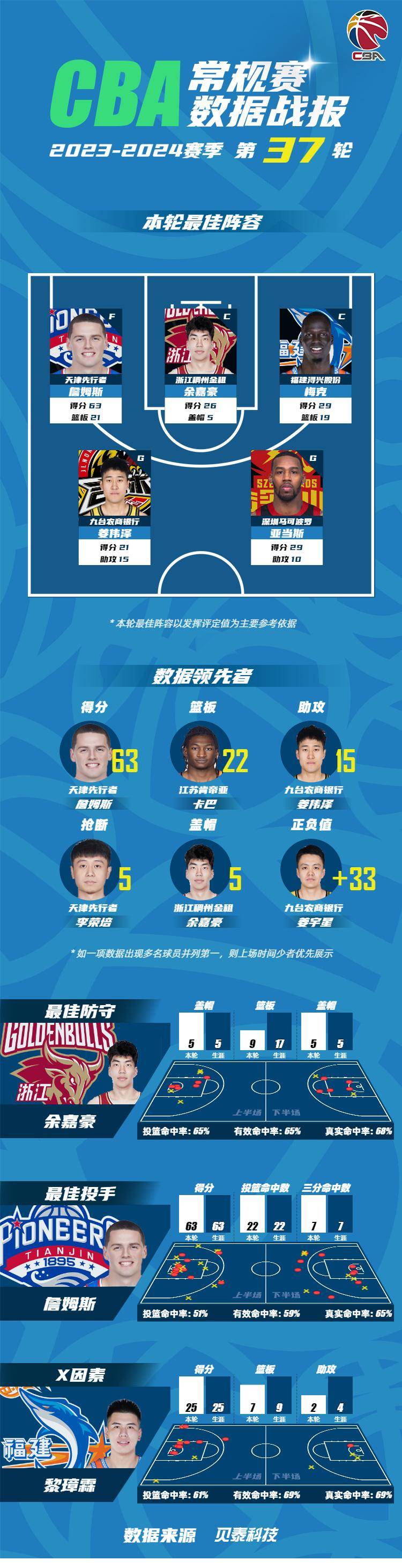 北京时间2月2日,2023-2024年CBA常规赛第37轮结束,天津荣钢篮球部詹姆斯、浙江州篮球部余嘉豪、福建迅兴SBS男子篮球队梅克、吉林东北虎男子篮球队姜伟泽和深圳新世纪豹篮球部亚当斯入选CBA常规赛第37轮最佳阵容!