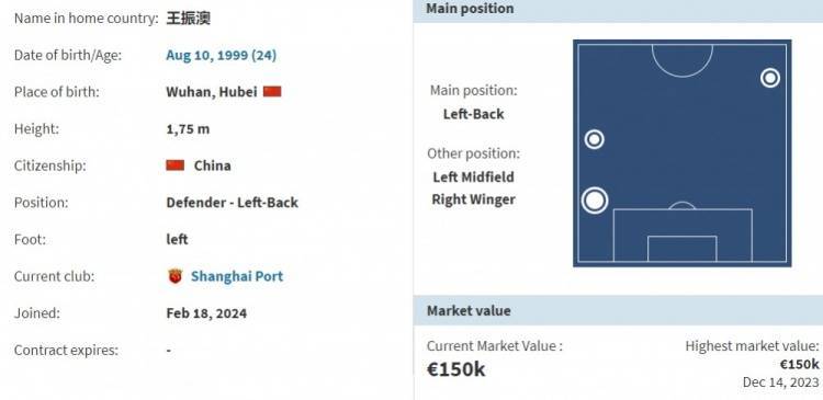 1999年8月10日出生的王振澳,2020年加入了大连人俱乐部。在2023赛季,王振澳代表大连人参加了23场比赛,其中18次首发,贡献了1次助攻。另外,王振澳还入选了国足亚运队名单,参加了杭州亚运会。