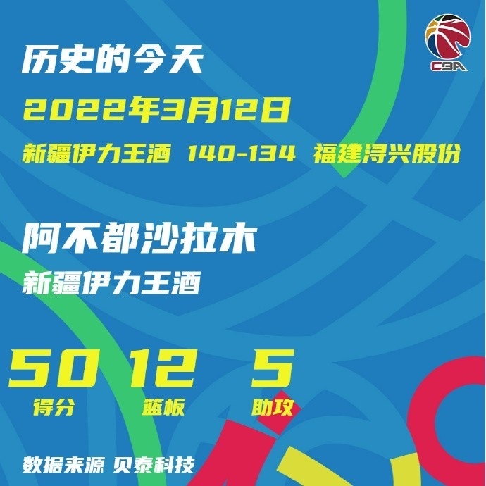 今天3月12日,cba历史上的50+12+5!阿不都沙拉木是唯一一个。