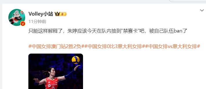 有个大V分析,只能这样解释,朱婷这次抽到了球队的“禁赛卡”,被自己的球队给ban。