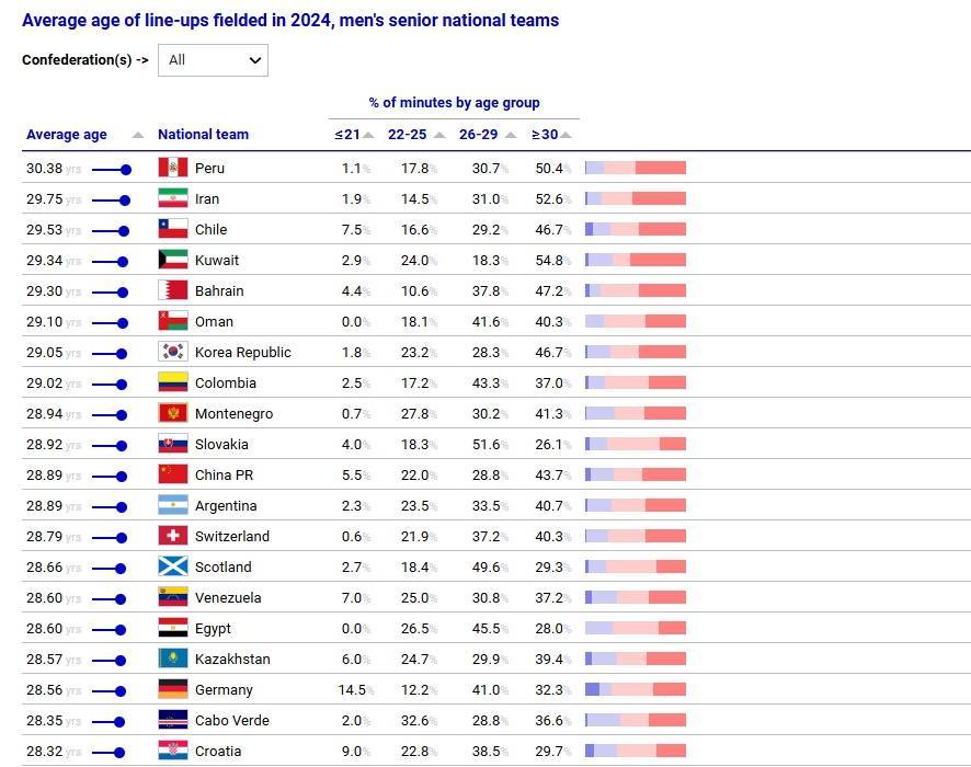 12月4日讯今日知名体育研究中心CIES(瑞士足球天文台)盘点了2024年国家队的平均年龄,其中秘鲁以30.38岁排名第一,多支亚洲球队排名第一,中国男足28.89岁与阿根廷并列世界第11。