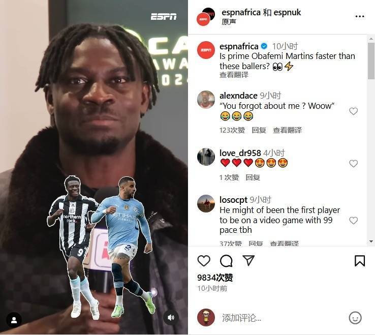 十二月十七日,国际米兰&中超老将、前尼日利亚国际球员奥巴费米-马丁斯近日接受ESPN采访,并谈到了自己的速度。