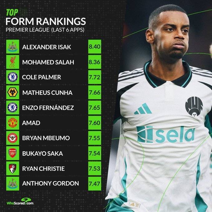 12月25日讯根据WhoScored统计,英超球员在最近6场比赛中的评分排名,伊萨克以8.4分位居第一,具体排名如下: