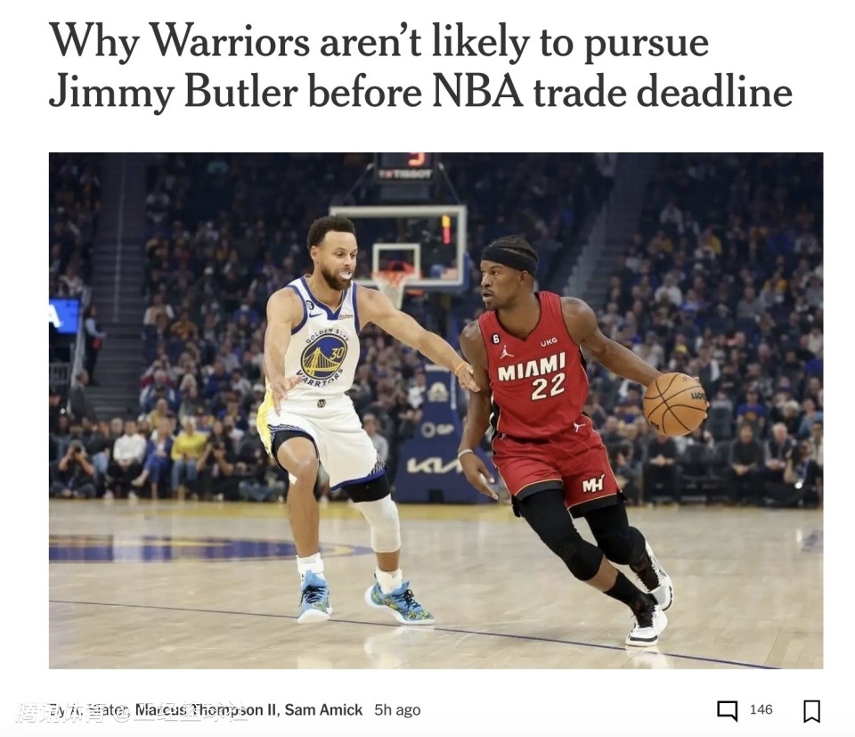 一位和巴特勒相近的消息源称,勇士队目前不被视为可行的选择,双方没有实质性谈判,也没有实质性成果。Anthony Slater指出,巴特勒本赛季的合同4800万美元,如果勇士队要交易巴特勒,意味着几乎一定要把维金斯和追梦的合同都放在交易框架中,另外还需付出几位角色球员。