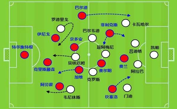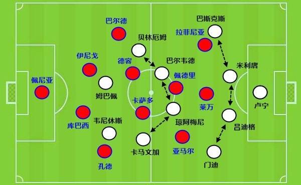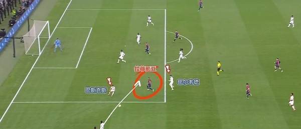 结果,巴塞罗那在两翼的起速能力仍然很强,球走到边路后,皇家马德里无法跟上速度。一旦防守依赖于控球员,巴塞罗那就可以在肋骨上找到皇家马德里的空间,完成快速传球和穿插连接。