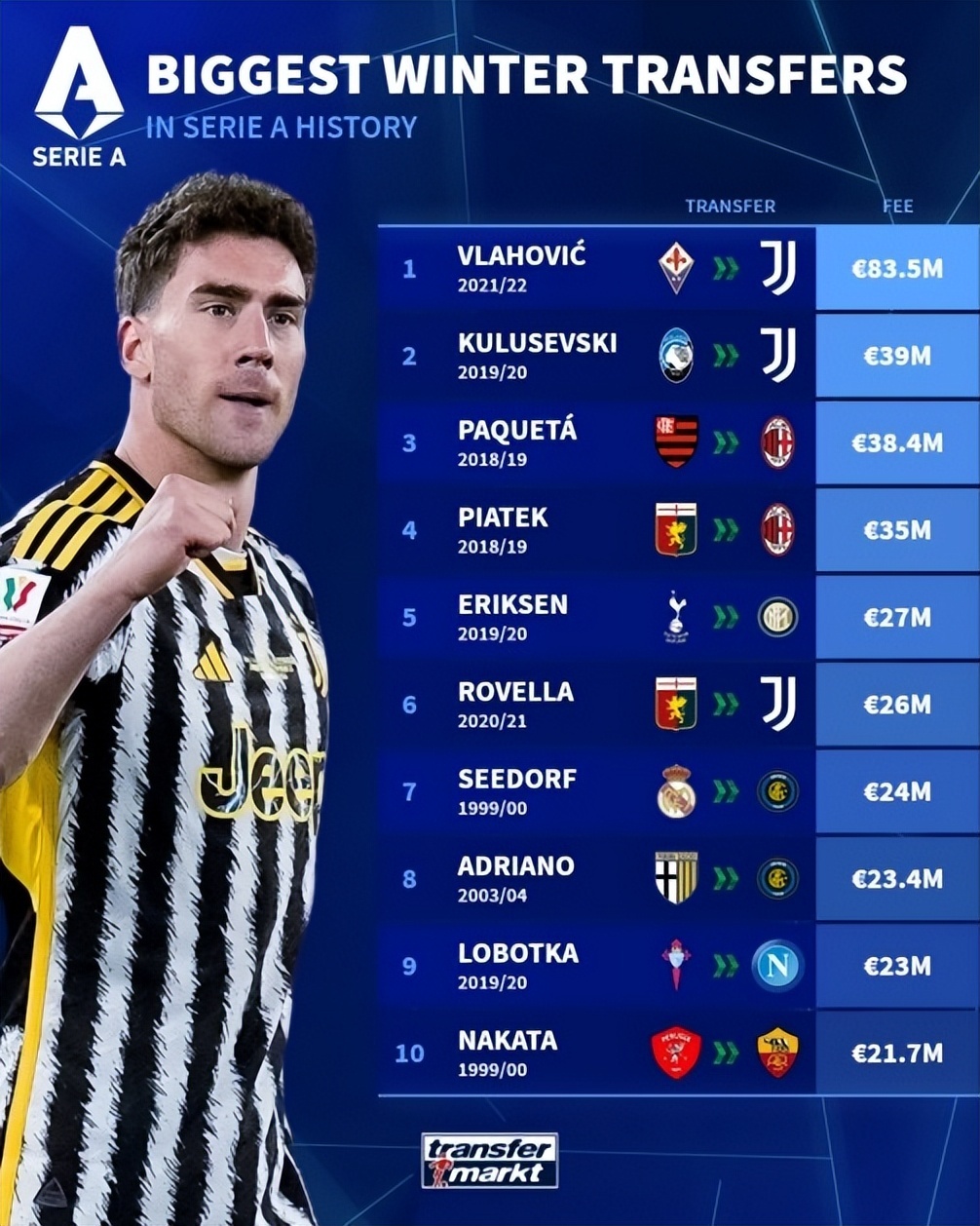 德国转会市场统计了意甲历史上冬窗最贵的签约名单,其中弗拉霍维奇以8350万欧元的转会费遥遥领先,库卢以3900万欧元排名第二。