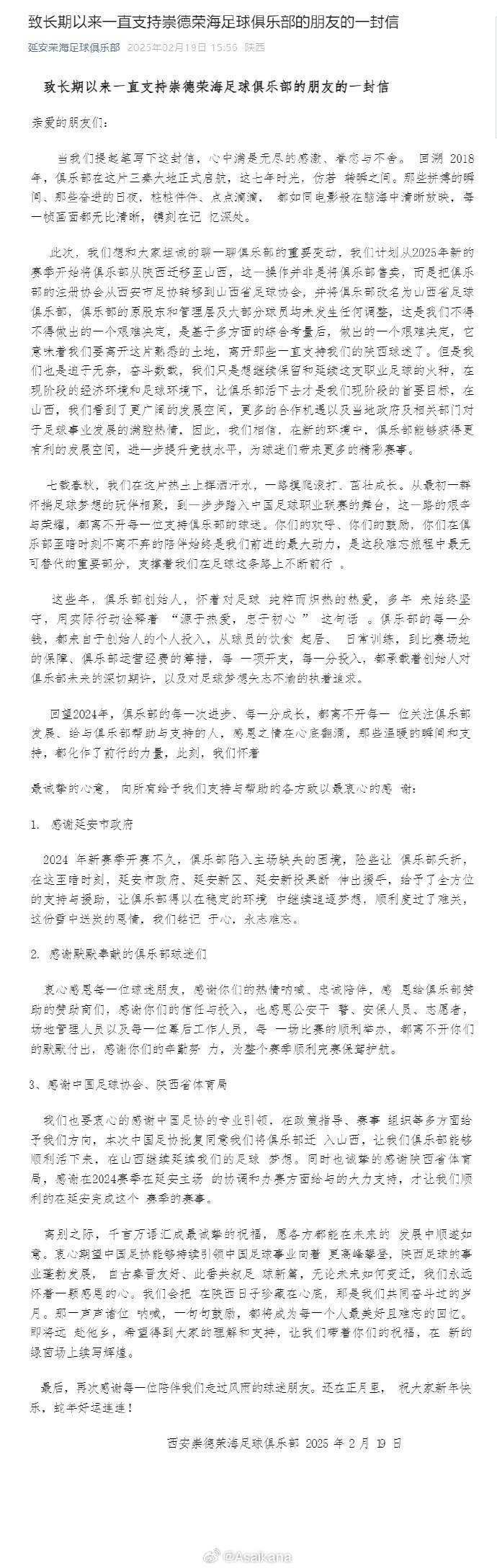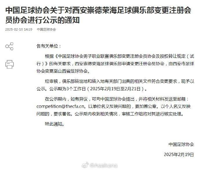 中国足协宣布Xi安崇德荣海足球俱乐部将从Xi足协变更注册地到山西足协。俱乐部微信官方账号发表的文章称,球队将更名为山西足球俱乐部。继上赛季两家俱乐部之后,这是《中国足协男子职业联赛俱乐部变更注册会员协会和股权转让规定(试行)》实施的第八家男子足球职业俱乐部。