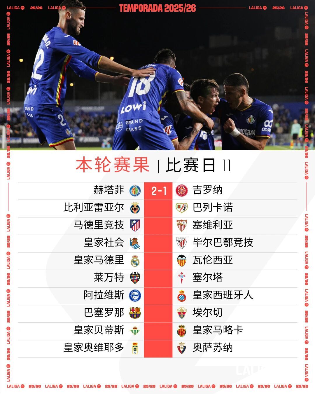 西甲第11轮今天上午开始:马里奥·马丁头球得分,马约拉尔在门前得分,斯图亚尼得分,赫塔菲2-1吉罗纳。