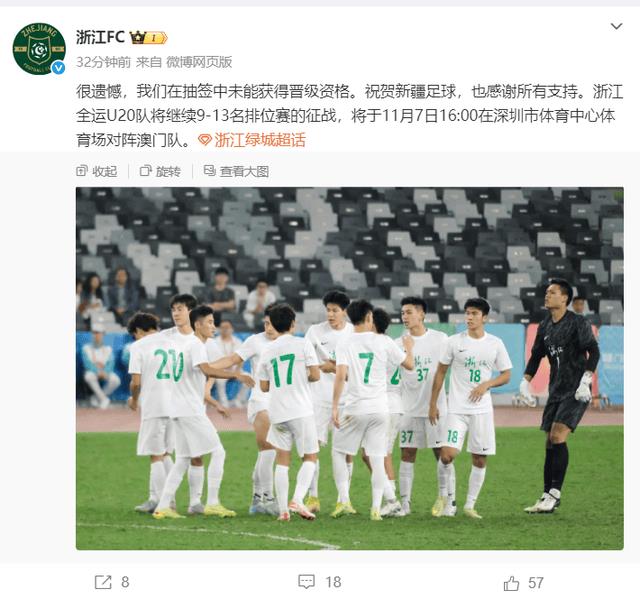 浙江和新疆都是两个进球,按照规则比较纪律,两队都是两张黄牌。在这种情况下,两队只能通过抽签来决定排名。6日抽签,新疆队运气更好。他们获得了小组第二名,浙江队获得了小组第三名。浙江队未能晋级,新疆队将在四分之一决赛对阵上海队,争夺半决赛。