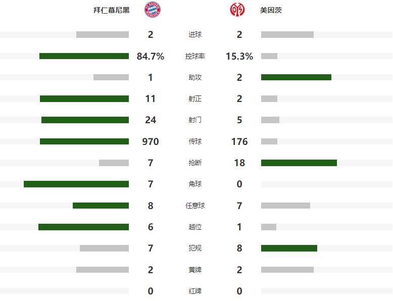 随着这场比赛的结束,拜仁对美因茨的主场八连胜和本赛季德甲全胜记录已经结束。然而,他们在德甲前14轮联赛中打进51个进球,创造了联赛的历史。虽然他们没有得到三分,但他们仍然在积分榜上遥遥领先,排名第一。