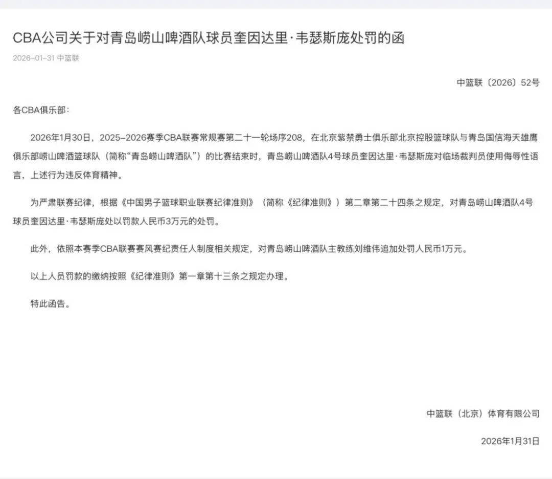 本来CBA公司对裁判的保护是非常严格的,所以一旦发生这种情况,威瑟斯庞就受到了联盟的惩罚。值得一提的是,在这张罚单发布之前,CBA公司刚刚完成了一张大罚单,CBA常规赛第21轮也发生在这张罚单上。在另一个比赛场地,南京同曦与四川的比赛在第四节最后1.3秒进行。领先32分的南京同曦放弃了防守,而四川13号球员左曦在接球后突然投了三分。这种行为违背了篮球场上“垃圾时间”的默契,所以马同号完全被马激怒了。
