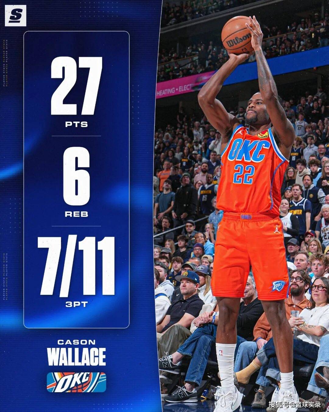 在这场比赛中,卡森华莱士成为了雷霆最大的奇兵,14中9,3分11中7,27分6篮板2抢断,单场27分,7记三分都是华莱士赛季最高的(之前最高17分,5记三分)。
