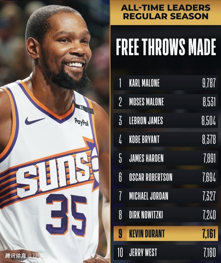 在太阳125-121战胜活塞的最后一场比赛中,杜兰特投篮27中13,三分8中2,罚球12中8,得到36分7篮板5助攻2抢断3盖帽的数据。杜兰特职业生涯罚球命中7164次,超过杰里-韦斯特7160次,独享NBA历史第九。