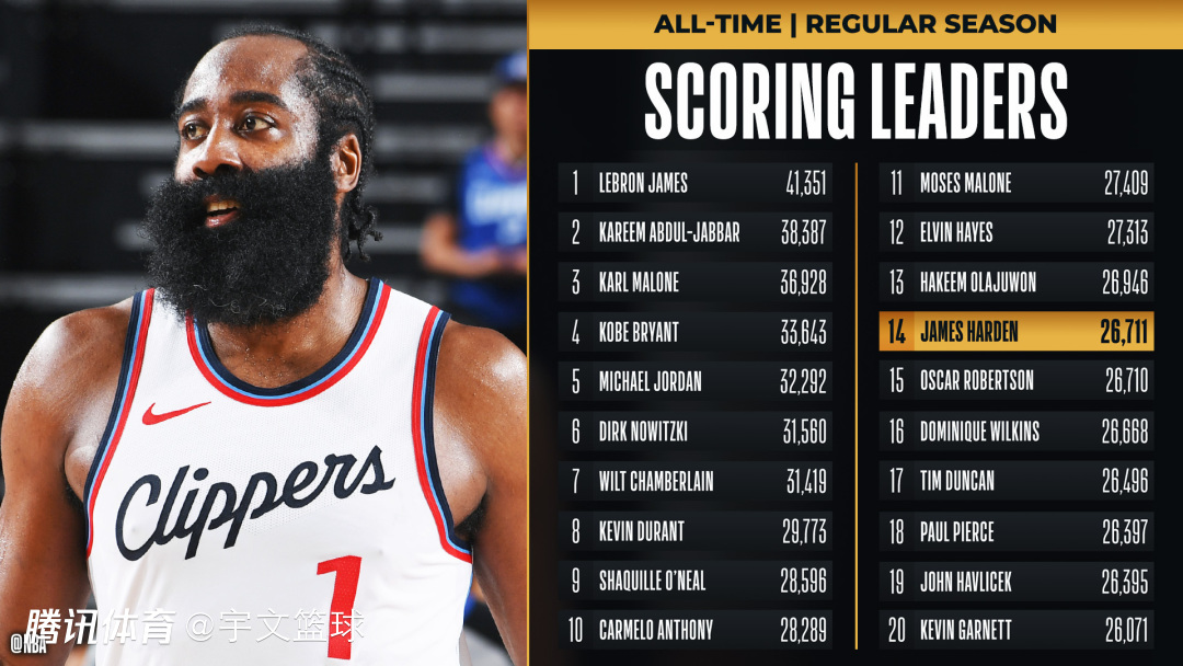 快船队主场116-102击败湖人队,赢得了本赛季首场洛杉矶德比。在这场比赛中,哈登贡献了21分4篮板12助攻,他的职业生涯总得分超过了26710大关,成功超过了奥斯卡-罗伯特森,达到了历史第14名,下一个目标是奥拉朱旺的26946分。现在,哈登的总分排在现役第三位,仅次于詹姆斯和杜兰特。