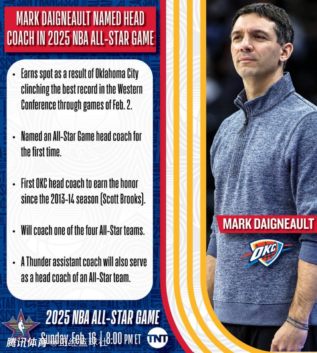 根据NBA的官方规定,全明星教练确定截点是2月3日,雷霆队已经确保了西部的第一名。NBA正式宣布,雷霆队教练戴格诺特将提前锁定全明星教练,并将执教四支全明星队中的一支。与此同时,雷霆队的助教也将执教其中一支全明星队。值得一提的是,戴格诺特也成为继2013-14赛季(布鲁克斯)之后第一位执教全明星的教练。